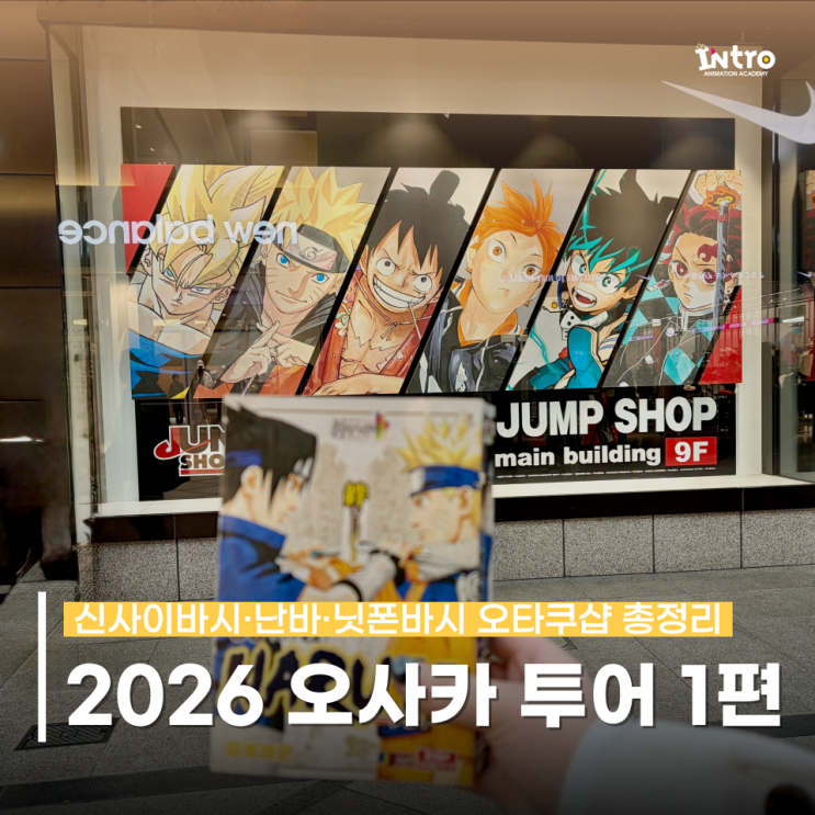 안녕하세요~ 부산애니인트로만화학원입니다. 다들 즐거운 겨울방학을 즐기고 계시나요? 저는 학원 방학기간 잠시 일본 여행을 다녀왔는데요 서브컬처에 관심이 많고 좋아하는 만큼 여행 중 꽤 많은 시간을 오타쿠 투어에 쓰고 왔답니다:) 오늘은 제가 방문했던 오사카 오타쿠 투어 장소를 2026 최신 버전으로 하루 만에 끝낼 수 있도록 정리해 소개해 드리려고 합니다. 이번에 일본 오사카 여행을 계획 중이라면, 이 글을 스크랩해두었다가 일정 짤 때 참고해 보세요! 제가 다녀온 코스는 짠! 이렇게 하루 만에 신사이바시·난바·닛폰바시·덴덴타운 지역을 돌아다니며 오타쿠 투어를 끝낼 수 있도록 짜봤어요! 물론 시간 여유가 되는 분들이라면 이....... <img src="https://blogthumb.pstatic.net/MjAyNjAyMDlfNDUg/MDAxNzcwNjAzNzcyNTMx.iYjbCrw3x1RgnxSZi0AYIKTwwWr-fzyejsukUGq4qiYg.KfrQrtwr8PHVPI9K5XYaEwxOmeT7Y72SBH6jEuhFMsYg.PNG/image.png?type=s3" />