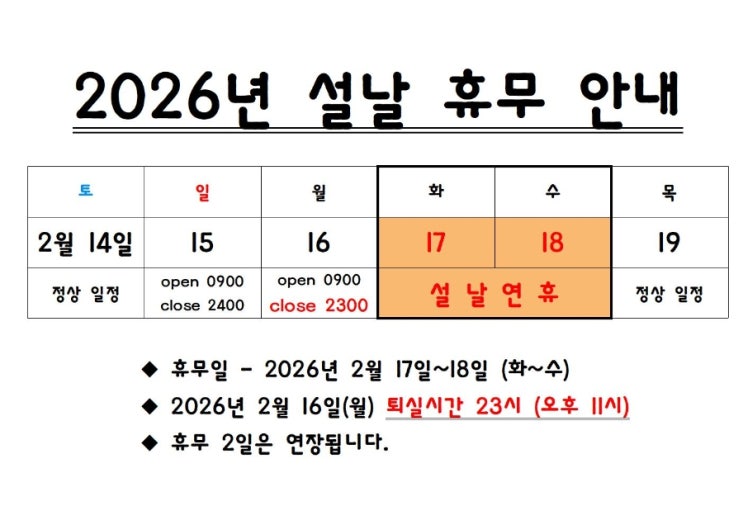 2026 병오년, 새해 복 많이 받으세요~ 설날 휴무 일정 안내입니다. 2월 17일, 18일 양일간 휴무입니다. 이용하시는데 착오없으시길 바랍니다. <img src="https://blogthumb.pstatic.net/MjAyNjAxMjNfMTg1/MDAxNzY5MTUzNDc5NzMx.IW_BB692UUJZ4kFe3oh2QTpnLRTyiffv6E1dZknzf4Eg.89AmbZlBc3Eyx0n2HOkpj12JqVZymNEH8pPu3QU5XzQg.JPEG/900%A3%DF2026_%BC%B3%B3%AF_%C8%DE%B9%AB001.jpg?type=s3" />