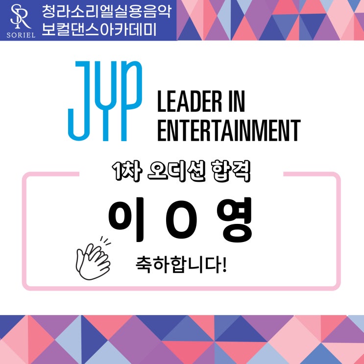 안녕하세요! 오디션 / 입시 / 취미 보컬 댄스 전문학원 청라소리엘입니다~^^ 오늘은 너무 기쁜 소식을 들고 왔어요~ 청라소리엘의 오디션반 수강생이 최근 진행했던 JYP엔터테인먼트 내방오디션에서 당당히 합격하여 2차 사옥 오디션을 준비하게 되었습니다~ 그동안 선생님들의 지도하에 수업뿐만아니라 연습도 지속적으로 지도받으며 열심히 준비해온 학생입니다. 보컬, 댄스 담당 선생님들이 지극정성으로 연습을 관리해주고 오디션 준비에 대한 컨설팅을 진행해주어 실력도 많이 늘게된 학생입니다. 다가올 2차 오디션에서 좋은 결과를 얻을 수 있도록 더욱 열심히 지도하고 연습 과정에도 함께하려 합니다. 청라소리엘은 오디션반에서 아이돌....... <img src="https://blogthumb.pstatic.net/MjAyNTEyMTVfMTAy/MDAxNzY1Nzg1MTMwMDA2.pdp2tSJUcRjrLWN5KkHmngu3F68Aa3tMUACkGdPabyQg.mECM-oLLGHdbKdXBZcKTeKY2lLzZO7vExXinQIKrR1Yg.JPEG/JYP%C7%D5%B0%DD%C0%DA%C6%F7%BD%BA%C5%CD%28%C0%CC%B4%DC%BF%B5%29.jpg?type=s3" />
