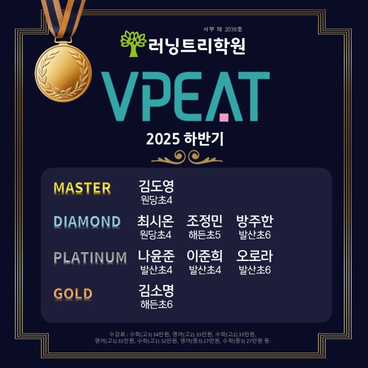 지난 11월 15일 토요일 비상교육에서 주최하는 영어능력평가대회인 V PEAT 시험이 있었습니다~ 저희 러닝트리학원 또한 지정고사장이어서 초등 영어수업을 듣는 학생들이 각 학년별 레벨로 시험을 치렀는데요~ 두구두구.......수상결과를 많이 궁금해하고 기대하던 중 짜잔! 드디어 2025 하반기 V PEAT 성적 및 수상결과가 나왔습니다~ 러닝트리학원에서는 총 8명의 학생들이 시험에 응시하여 다음과 같은 결과를 받았답니다!^^ 6학년 방주한 학생은 본래 자신의 레벨보다 ’한 단계 상위레벨로‘ 응시해서 보았음에도 다이아몬드 (Diamond) 등급을 받았어요~ 4학년 김도영 학생은 무려 마스터(MASTER) 등급을 받았는데요~ 마스터 등급은 출....... <img src="https://blogthumb.pstatic.net/MjAyNTEyMThfMTQz/MDAxNzY2MDY4NjM1OTM0.lqt9UIqPnN-_x-b8yzPlh7vq2HtC6Hk_wxCRTYDhxtgg.CdpLH3OgFTx7Dojf2YVjUmpT9T4VIhZXJBoQvU7MP4cg.JPEG/V-PEAT_%BC%F6%BB%F3%C0%DA.jpg?type=s3" />