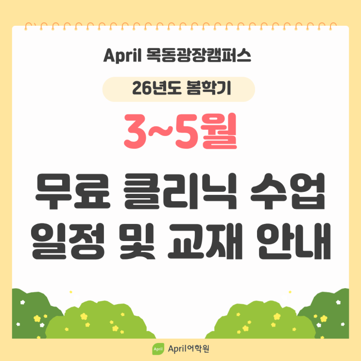 [에이프릴 목동광장캠퍼스] ◆26봄학기 무료 클리닉 (파닉스, 라이팅, 문법) 수강 일정 및 교재 구매 안내◆