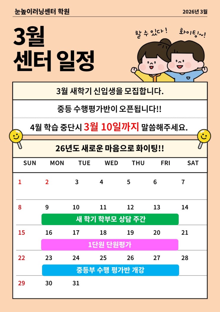 오늘부터 새학기가 시작되었습니다. 그동안 겨울방학동안 쌓은 기초 실력을 발휘할 수 있기를 바랍니다. 겨울방학 일정이 끝나고 오늘 하루는 일찍 나오지를 못했습니다. 몸살이 난건지 푹 자고 일어나니 회복이 되었습니다. 주엽영어학원 푸른꿈영어학원은 오로지 "학생 실력 향상에만 집중"하겠습니다. 작년과는 다른 내신 준비로 학생들이 공부하는 3시간을 알차게 보내도록 하겠습니다. 주엽영어학원 푸른꿈영어학원이 학생 실력 향상에 집중하기 위해서 어떻게 하는지 직접 보여드리겠습니다. 1. 단어 시험의 변화 작년에는 단어 의미만 시험을 봤습니다만 독해에 도움이 딱히 되지 않는다는 판단하에 올해부터는 교과서 단어 시....... <img src="https://blogthumb.pstatic.net/MjAyNjAzMDNfMTQ4/MDAxNzcyNTE1MzI4MTgw.UzLkAs-Z59rKurF0qXynzbgJNX7SPrFBUoV_l6rTgkcg.KvbY64xpyItSx5kpHppLi5Opx4HfRZRduGWdv48VISEg.PNG/image.png?type=s3" />