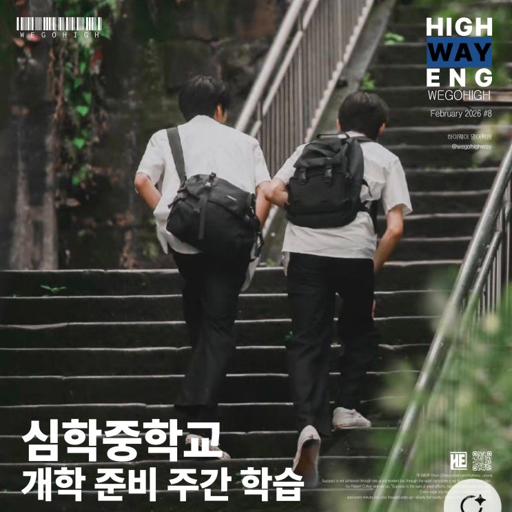 심학중학교 영어, “잘 버티는 것”이 아니라 “잘 해내는 것” 하이웨이 영어학원의 심학중학교 재학생들을 위한 영어 학습 목표는 분명합니다. 학교 수업을 따라가는 수준이 아니라, 상위권을 안정적으로 유지하는 것. 중2 영어는 더 이상 ‘중등 중간 단계’가 아닙니다. 중3~고1 초입 수준의 문장 구조가 새로 개정된 교과서에 배치되어 있으며, 고등 독해의 기초 구조를 훈련하는 단계로 성격이 바뀌었습니다. 따라서 지금 필요한 것은 단순한 예습이 아니라, 문장 구조를 다루는 힘을 미리 확보하는 전략적 준비입니다. 중등에서 잘 해내야 하는 것은 분명히 고등학교에서 잘 해낼 수 있는 토대를 마련합니다. 중등 과정을 어느 정도 따라....... <img src="https://blogthumb.pstatic.net/MjAyNjAyMjVfMTc3/MDAxNzcxOTkyMjgxOTkz.BKKernf1lA4QDss4y7xn96lLEbj1lURq6xIl6lx2OTwg.tYC8iuSsMNSaHTPJlbcJXM3xtbvVx1JAayqoToKqhQEg.JPEG/%BD%C9%C7%D0%C1%DF%C7%D0%B1%B3_%281%29.jpg?type=s3" />