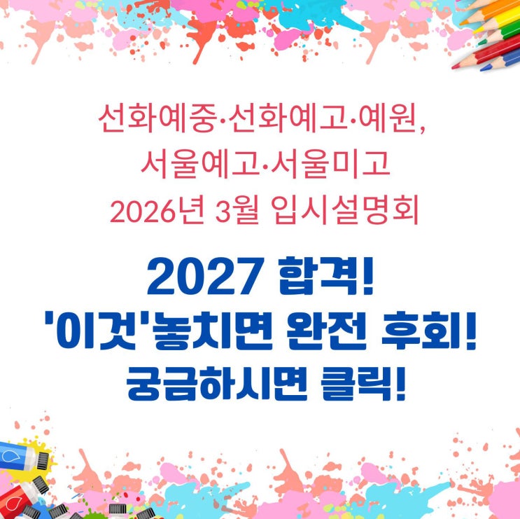 선화예중·예고·예원, 서울예고· 서울 미고-2027 합격, '이것' 놓치면 정말 후회! 3월 입시설명회, 예중 예고 입시에 대해 고민이시라면 꼭! 참석하세요! 안녕하세요. 매년 예중·예고 입시에서 95점대 실기 실력으로 합격을 만들어내는 강남 꼬레 아트 미술학원 대표원장입니다. 제가 미대입시와 예중 예고 입시 현장에서 수험생과 함께 보낸 시간 30년 이상, 예고 출강과 미술 실기지도만 해온 저의 경험으로 예중 예고 합격 꿀팁을 이번 설명회에서 공개하겠습니다. 예중 예고 입시하면 무슨 생각이 드시나요? 그리고 우리 아이 합격을 위해 무엇이 필요할까? 생각해 보셨나요? 그 내용을 하나씩 알아보는 시간을 가지려고 합니다. 시....... <img src="https://blogthumb.pstatic.net/MjAyNjAyMjJfNTkg/MDAxNzcxNzYyNzA3NzIy.XiSzUOP1pu2T3fP-B9KPARKOor6mgBqi4qCsOcMdVqAg.slyiJY6xCMRjlRGY_Jxyc04ReSPUrNRCmxvAQaCYHQQg.JPEG/2026%B3%E2_3%BF%F9%BF%B9%C1%DF%BF%B9%B0%ED%C0%D4%BD%C3%BC%B3%B8%ED%C8%B8.jpg?type=s3" />