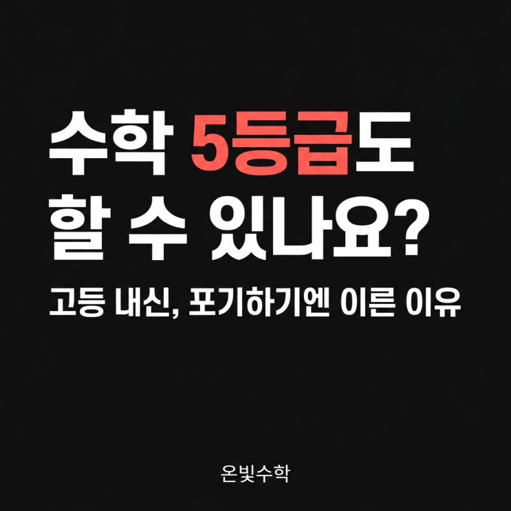 안녕하세요. 대구 수성구 범어동 수학학원, 온빛수학학원 입니다. 우리 아이가 고등학교 가서 수학 5등급을 받았어요. 내신은 가망이 없는 것 같은데… 지금이라도 수시 포기하고 정시로 돌리는 게 맞을까요? 중학교 때는 곧잘 했던 터라 5등급이라는 숫자가 주는 충격은 배가 될 수밖에 없죠. 하지만 저는 이렇게 생각합니다. 수성구에서 수학 5등급은 포기할 때가 아니라, 진짜 약점을 고치고 도약해야 할 가장 완벽한 타이밍입니다. 오늘은 중위권 성적표를 받고 좌절했던 아이가, 온빛수학학원과 함께 어떻게 성적을 뒤집었는지 그 치열했던 이야기를 들려드리려 합니다. 수성구 고등 수학, 중위권의 진짜 의미 수성구 주요 고등학교 — 경신....... <img src="https://blogthumb.pstatic.net/MjAyNjAyMjJfNDkg/MDAxNzcxNzU5MTE5NDk3.ZPxCVpdDxeQJagN9CCgFExjTHjBaDKMSvns7BVMOsfwg.HVxfYkCUCdLya--unwOjpGywcIxst9yqeK6qRCyQ48sg.PNG/%B9%FC%BE%EE%B5%BF_%B3%EB%BA%A3%C0%CC%BD%BA_%BC%F6%C7%D05.png?type=s3" />