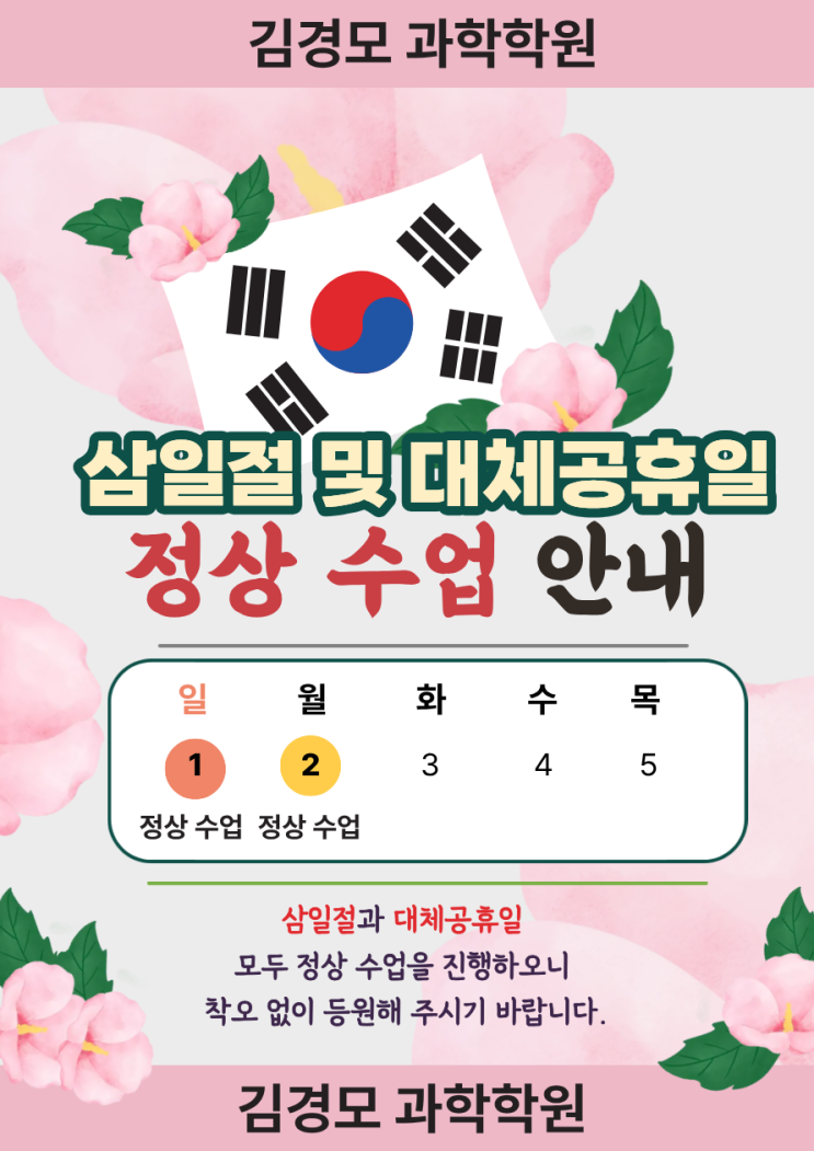 안녕하세요 김경모과학학원입니다 곧 있을 삼일절 및 대체공휴일 수업 일정에 대해 안내드립니다. 3월 1일 삼일절은 우리 민족의 자주독립 정신을 기리는 뜻깊은 날입니다 그 의미를 되새기며, 저희 학원은 삼일절 및 대체공휴일 모두 정상 수업을 진행합니다. 수업 시간은 기존 시간표와 동일합니다. 공휴일로 인해 등원에 혼선이 없도록 확인 부탁드리며, 아이들의 학습 리듬이 이어질 수 있도록 많은 협조 부탁드립니다 감사합니다. 궁금하신 내용은 언제든지 학원으로 연락 주시면 친절히 안내 도와드리겠습니다❤️ 1호관 053-639-6599 2호관 053-638-6599 3호관 053-631-6599 ( 원하시는 호관 번호 클릭 시 바로 전화 연결 가....... <img src="https://blogthumb.pstatic.net/MjAyNjAyMjNfMTE0/MDAxNzcxODQ0Mjk0OTk5.XgCs6V4O9HvMkyxSz1Q0GpeyzVQZ1ymsRXfCZ6G5wKIg.suJ2DM6z8D0RtsmGfgYU-Tramyqx_1eVgHvze7ghLKog.PNG/%BB%EF%C0%CF%C0%FD.png?type=s3" />