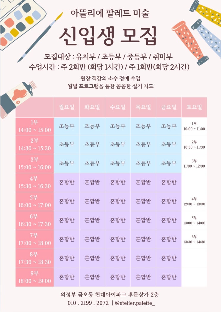 아뜰리에 팔레트 (Atelier Palette) 경기도 의정부시 금오동 부용로 95, 25 현대 아이파크 아파트 상가 2층 010.2199.2072 카톡 ID atelierpalette • • • 금오동 미술학원 추천 소수 정예 원장 직강, 아뜰리에 팔레트 미술 안녕하세요. 아뜰리에 팔레트 미술입니다:) 새 학기를 앞두고 “어떤 미술학원이 우리 아이에게 맞을까?” 많이 고민되시죠? 단순히 그림만 그리는 수업이 아닌, 아이의 표현력과 기초 실력을 함께 키워주는 곳을 찾고 계신다면 아뜰리에 팔레트 미술을 소개합니다. 모집 대상 유치부 (2022년생부터) *** 22년생은 생일 이후부터 수업 권장 *** 초등 저학년 초등 고학년 중등부 연령별 맞춤 커리큘럼으로 운영됩니다. 수....... <img src="https://blogthumb.pstatic.net/MjAyNjAyMjNfMjYx/MDAxNzcxODIxODQwNzk5.5MfGXRMKQaOM9FivGXPWDeRlw_vHDOKnUS4srk-nDVog.teEWL3D0ThBI1gAKUrGnIWxQ5l-l_j7tuup_X2pjy6Ug.JPEG/KakaoTalk_20260223_132509877.jpg?type=s3" />