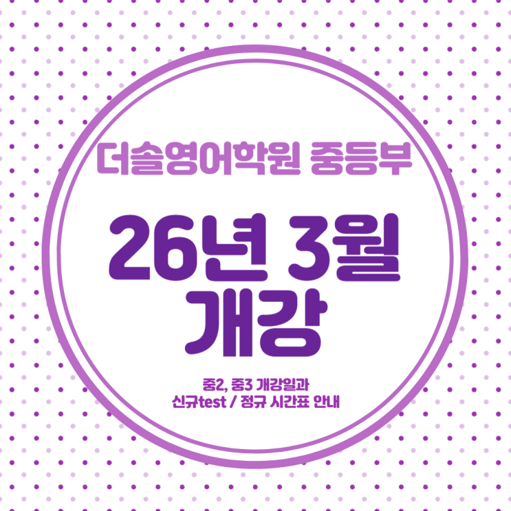 #더솔영어학원 #안산고잔동영어학원 #새학기 #중등영어 안녕하세요. 안산 고잔동 영어학원 더솔영어학원입니다. 뿌듯한 겨울방학 보내고 계신가요~? 저희는 요즘 중/고등학생들 겨울 방학수업을 열심히 하고 있답니다. 꾸준하게 실력을 쌓아가는 더솔영어학원 중등부 아이들이 기특하고 대견하답니다. 새 학년, 학기를 맞아, 중학교 2학년 3학년 개강 및 신규생 테스트 안내를 해 드리기 위해 찾아왔어요 더솔영어학원 검색하셔서 네이버톡톡 으로 상담도 가능하시고 네이버예약 으로 신규 테스토 예약도 가능하답니다. 아래 방법도 자세하게 알려드릴께요!:-) 중2 중3 개강일 중2 중3 3월 4일 (수) 3월 5일 (목) 3월 첫 주에 모두 학교 개학을 하....... <img src="https://blogthumb.pstatic.net/MjAyNjAyMjFfMTAx/MDAxNzcxNjM0NzIwNTk0.4TroJK9TzGJ-E6aNAhHg9kh5IgzbQEbSCF3f0f38dG0g.565TnOH8MeRV-St-e2Cl5jfl_udEEd6BQwMJ73TGWykg.PNG/%C1%A6%B8%F1%C0%BB_%C0%D4%B7%C2%C7%D8%C1%D6%BC%BC%BF%E4_-025.png?type=s3" />