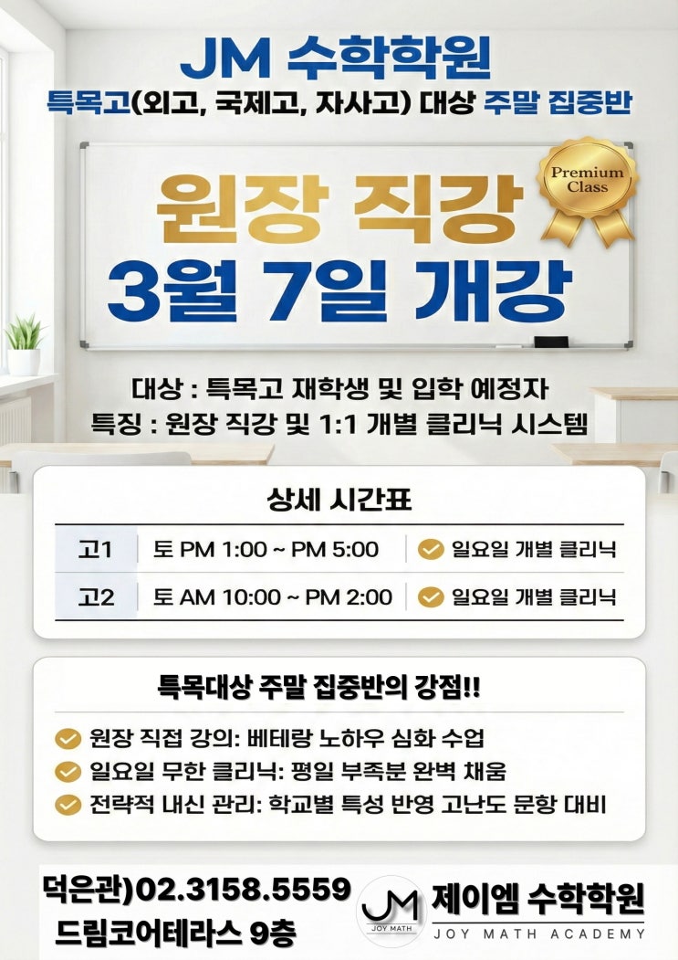 안녕하세요. 제이엠 수학학원 조이매쓰입니다. 언제나처럼 초심을 잃지 않고, 겨울방학이라는 시간을 발전의 기회로 삼아서 끝까지 학생들과 최선을 다해 특강 및 본 수업을 진행하고 있습니다. 어느덧 길었던 방학이 끝나가고 설레는 새 학기가 코앞으로 다가왔습니다. 새로운 출발선에 선 우리 아이들이 탄탄한 수학 실력으로 걱정 없이 한 발 더 앞서 나갈 수 있도록, 원장 직강 개강반 소식을 안내해 드립니다. 1. 초등 대상 중등 과정 선행반 본격적인 중등 수학의 기틀을 다지는 반입니다. 수강 대상: 초등 과정 학습이 완료된 초등학교 5, 6학년 수업 특징: 원장직강반, 핵심을 찌르는 판서 수업, 중등 수학의 뼈대를 잡고 올바른 공부 습....... <img src="https://blogthumb.pstatic.net/MjAyNjAyMjNfODcg/MDAxNzcxODQzNTYxMTY2.h9a_NfpY1f3f2t7PhOY76CMDylOABYSJhZTVtztkCCYg.cKiXVJLeSy0-LtBFEbWdKqLbnkPawHgBDuKCVMwA_kIg.JPEG/%C6%AF%B8%F1%B4%EB%BB%F3_%BF%F8%C0%E5%C1%F7%B0%AD_%C1%D6%B8%BB%B9%DD.jpg?type=s3" />