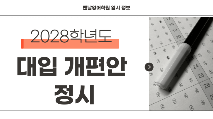 안녕하세요. 운정 입시독해의 완성, 맨날영어학원입니다. 이번 입시 관련 글에서는 2028학년도 대입개편안 중 정시 전형의 핵심 변화를 살펴보겠습니다. 이번 대입개편안에서 눈여겨봐야 할 부분은 바로 수능 체제의 변화입니다. 과목별 시험 시간과 문항 수는 현행과 비슷하게 유지되지만, 출제 방식과 시험 구조에는 중요한 변화가 예고되어 있습니다. 오늘은 운정 지역 학생과 학부모님들께 꼭 필요한 2028학년도 대입 정시 주요 변경사항을 핵심만 정리해 드리겠습니다. 2028년도 수능 영역별 문항 수 및 시험 시간 2028년도 수능 주요 변경 사항 자료 먼저, 국어와 수학 영역입니다. 국어는 45문항 80분, 수학은 30문항 100분으로 현행 수능....... <img src="https://blogthumb.pstatic.net/MjAyNjAyMDJfNjAg/MDAxNzcwMDAzNzY0MDEx.C8d9m36btmTkzbFkYJxG3hhzXlCCluOaA7BZJ-jcaRgg.55eOn7fTY5puL9h5cJAtuVasQOHl-AS_dAV7g_fIjO8g.PNG/001.png?type=s3" />
