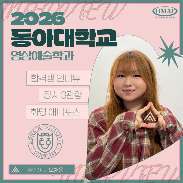 2026 동아대학교 영상예술학과 정시 합격생 인터뷰입니다. 2026 화명애니포스 4기 중앙대, 경기대, 홍익대, 청강대, 상명대, 한성대, 건국대, 공주대, 부산대, 동아대, 경성대, 계명대, 동서대 이 외 다수 대학 합격을 축하합니다! 1️⃣ 합격 & 지원 동기 Q. 먼저 합격을 축하합니다! 이번에 어느 대학에 합격했나요? 채은 > 동아대, 경성대, 인제대에 합격했습니다! Q. 동아대에 지원하게 된 동기는 무엇인가요? 채은 > 영상예술전공 수업에서 배울 수 있는 다양한 수업들이 매력적이라고 느껴졌고, 무엇보다 고1, 고3 때 들어오셨던 동아대 다니시는 강사선생님들 영향도 크게 받은 거 같아요! 부산권 대학 중 마음속 1순위....... <img src="https://blogthumb.pstatic.net/MjAyNjAyMTlfMTc1/MDAxNzcxNTA1NDg5Nzg2.hg6ST8NThU3JMQqs5IE3IZzJAE9cqoo8fRYCpMQS9mcg.Dvp3YbOurBt8Vfv49rsnV7mTzknn3yXrKwQmTW3yxAgg.JPEG/IMG%A3%DF5063.JPG?type=s3" />