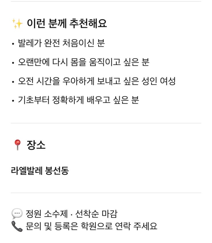라엘발레 봉선동 연예인들 사이에서 요즘 가장 핫한 발레 왕초보를 위한 오전 클래스 오픈 뻣뻣 해도, 몸치 여도 괜찮아요. 발레가 처음인 분들을 위한 가장 안전하고 우아한 시작 예술고 15년 교사 경력 원장직강 기본 자세, 아름다운 바디 라인까지 차원이 다른 클래스 발레 수업을 경험 하세요. 수, 금 오전 9시 40분 개강: 2026년 1월 2일 금요일 오전 9시 40분 * 현재 잔여석이 거의 없습니다. ✨지금 당신의 일상에 발레를 더 하세요 봉선동 라엘발레 문의: 010-7757-1212 #봉선동성인발레 #광주발레 #봉선동발레추천 #남구발레 #학동발레 #주월동발레 <img src="https://blogthumb.pstatic.net/MjAyNTEyMjBfMjk0/MDAxNzY2MjQxNzAzNTUz.DSB8wftcLqZRVm6IYxDHGv2ltmMnfDuswXdQ0HmwS7Ug.wkYkklKdbB2bbypja57jXyEqJa5E6OMzH8yON1QwmzAg.JPEG/IMG%A3%DF1995.jpg?type=s3" />