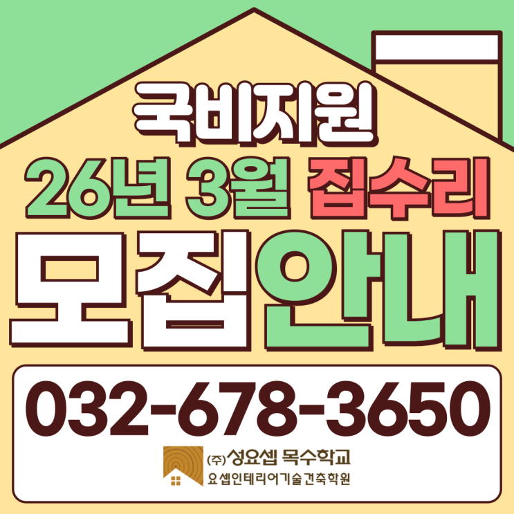 안녕하세요. (주)성요셉목수학교 요셉인테리어기술건축학원입니다. 26년 3월에 개강하는 평일집수리과정 모집안내합니다! 등록을 희망하시는 분들은 아래의 일정표를 참고하여 학원 032-678-3650으로 전화주시기 바랍니다. 26년 3월에 개강하는 집수리과정은 인테리어목공, 벽체단열, 타일시공, 욕실설비, 전기내선공사 기술을 배울 수 있는 실무과정입니다. 문의사항이 있으시다면 학원 032-678-3650으로 전화주시기 바랍니다. 학원 홈페이지에 상세 커리큘럼이 게시되어있으니 참고해주시기 바랍니다. 감사합니다. <img src="https://blogthumb.pstatic.net/MjAyNjAxMjdfMTY4/MDAxNzY5NDg4Mjg4NDE5.8gONyTkgipBq4RsF0EPXh5kcavIrF9vqqFBHFRVIPD4g.OUAMOEqj5mALjrdqkfePgnr8tMwjKrDRaESIKCZ56Z8g.PNG/%C1%A6%B8%F1%C0%BB-%C0%D4%B7%C2%C7%D8%C1%D6%BC%BC%BF%E4_-008.png?type=s3" />