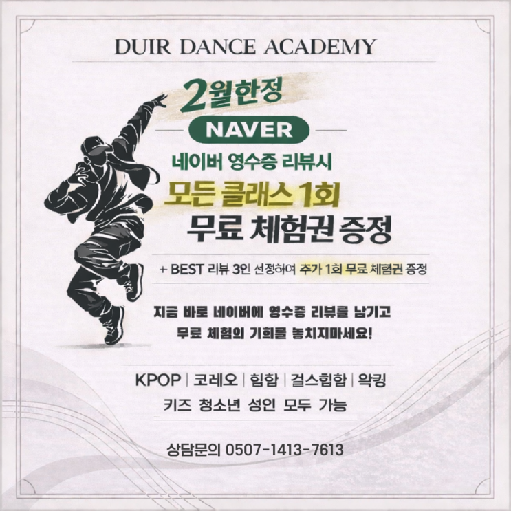 춤 한 번 제대로 배워보고 싶다는 생각, 한 번쯤 해보셨죠? 영상 보면서 따라 추다가도 막상 학원 등록은 괜히 망설여지게 되잖아요. 그래서 오늘은 부담 없이 시작할 수 있는 무료 체험 기회를 소개해드리려고 해요 :) 2월 한정으로 진행되는 듀이르 댄스 아카데미 특별 이벤트‼️ 네이버 리뷰만 남기면 클래스 상관없이 1회 무료 체험권을 받을 수 있습니다. 이벤트 혜택 안내 네이버 영수증 리뷰만 남기면 클래스 1회 무료 체험권 증정! 그리고 여기서 끝이 아닙니다! ✨ BEST 리뷰 3인 선정하여 ➡️ 추가 무료 체험권 1회 더 증정 리뷰만 써도 춤을 무료로 배울 수 있는 기회라니… 이건 진짜 놓치면 후회각 이런 분....... <img src="https://blogthumb.pstatic.net/MjAyNjAyMDNfMTQ2/MDAxNzcwMDg1MDg1MzQ5.hUwdLzjZ7f-5dbTTsgOPzyAhIaHvKETFZUyPnEW28yAg.8y-2lkQgbuxtomcGRawklfexKqjH7ezg8v76IcG1p2Qg.PNG/IMG%A3%DF5719.PNG?type=s3" />