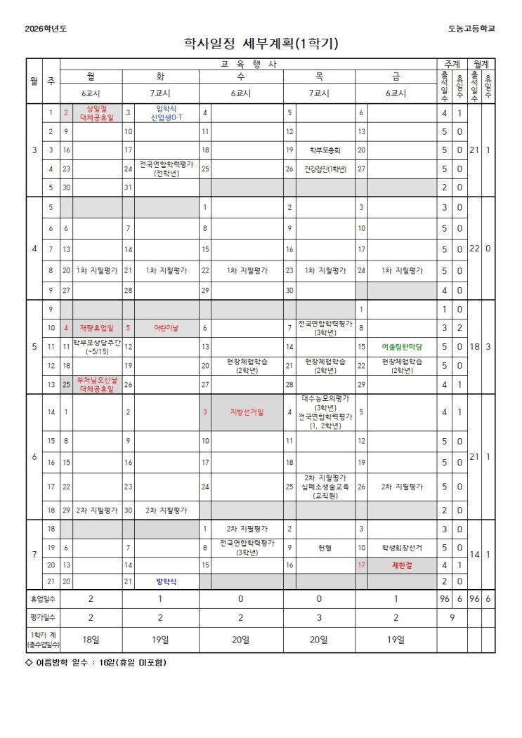 2026학년도 도농고 학사일정