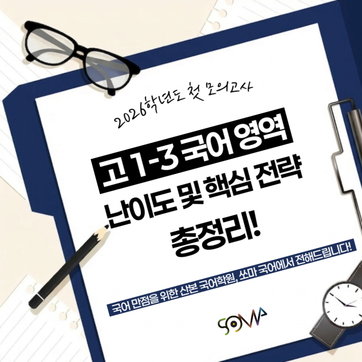 안녕하세요. 국어 만점을 위한 산본 국어학원! 쏘마 국어 학원입니다. 새 학년의 첫 관문인 3월 전국연합학력평가가 치러졌습니다. 이 시험은 겨울방학 동안의 학습 성과를 확인하고, 새로운 학년에서의 출발선을 가늠해볼 수 있는 중요한 기회이기도 합니다. 또한 자신의 현재 위치를 객관적으로 파악하고 앞으로의 학습 전략을 설계하는 데 있어 핵심적인 기준이 되어줍니다. 오늘은 2026학년도 3월 학력평가 학년별 국어 영역 핵심 분석 내용을 전해드리려고 합니다. 이번 시험은 단순한 점수 확인을 넘어 학습의 시작점을 점검하는 매우 중요한 지표가 되어줄 것입니다. 1. 3월 학평 학년별 총평 이번 3월 학평은 각 학년마다 뚜렷한 특....... <img src="https://blogthumb.pstatic.net/MjAyNjAzMjRfMTA4/MDAxNzc0MzE4MzE1ODA2._GIIZSvSevI4qrdDwPO3fM6DozkA1MW4oNdPCyDLQIkg.loGHNu_dJTPiqd9gY0tboX0MQh3GSWow4bv0T6D7DnIg.PNG/%BB%EA%BA%BB_%B1%B9%BE%EE%C7%D0%BF%F8-001_%282%29.png?type=s3" />