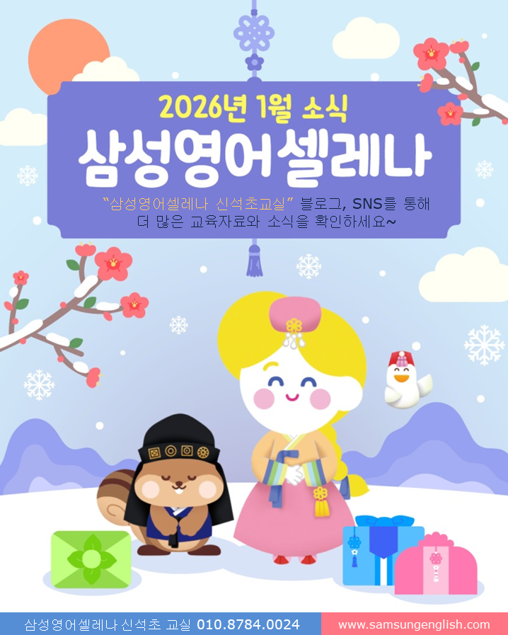 안녕하세요^^ 내년 1월 새해 소식지 안내 해드립니다. 1월-2월에는 4주/6주 문법특강이 오전에 시작합니다. 타학원은 보통 정규수업 뒤로 특강을 진행하지만, 저는 긴 방학 아이들의 오전 시간을 잘 활용 할수 있도록 오전 10:00~12:00에 진행하고 있습니다. 대상은 예비 중1-예비 고1이며, 선착순으로 1:1 개별 맞춤 수업합니다. 그동안 어려웠던 영역,(기초 be동사- 조동사) 꼭 완성하고 싶었던 파트별 영역(준동사/관계사/가정법)을 골라서 수업을 들을 수 있습니다. 이번 기회를 통해 힘들고 어려웠던 문법을 정복 해봅시다! 또 1월말에는 500단어(중고등)/200단어(초등)영단어 경시대회가 있습니다. 그동안 공부 했던 단어를 복습하며, 다지....... <img src="https://blogthumb.pstatic.net/MjAyNTEyMjFfMTMw/MDAxNzY2MzE1ODA3Mzk1.8egfiajD1ZnVJn0iWKbJCnhBhMBbN-x70W9yInTwbT4g.cs3S7xk8_3159fdWR-kYm1rWspdclU2fNgloxaigRdQg.PNG/1766314979150.png?type=s3" />