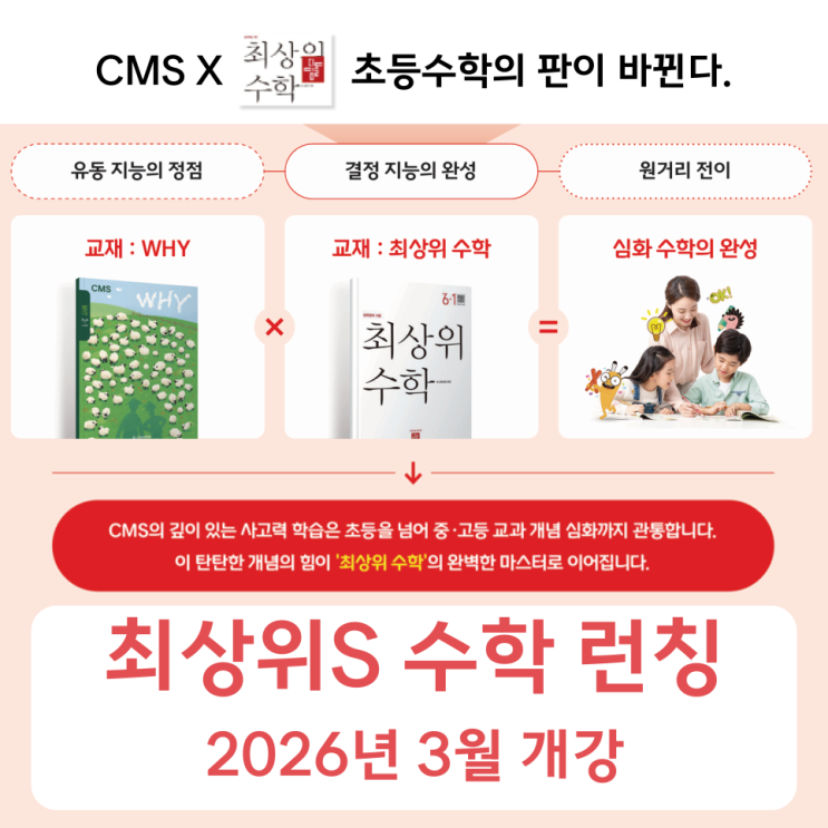 안녕하세요~ CMS 목동센트럴 사고력수학관 센트럴쌤입니다! 이번 봄 학기부터 사고력수학관 재원생을 위한 최상위S 교과 수업이 론칭합니다. 최상위S 수업이 어떻게 진행되고 어떤 장점이 있는지 알아볼까요? ※ 최상위S 수업은 사고력 재원생만 수강이 가능합니다. 초등 수학, "완전체"가 만나다. CMS와 최상위 수학을 이어주는 심화 전문 강사 메타인지(Meta) + 포스트잇(it) = META-IT(메타잇) -> 아이의 생각을 붙잡아, 실력으로 만드는 학습 시스템 아이 스스로 자신의 사고 과정을 점검하고, 수정하고, 확장하는 사고 훈련 기반 오답관리 시스템입니다. 초등 수학의 판이 바뀐다? CMS + 최상위 수학 = 심화 수학의....... <img src="https://blogthumb.pstatic.net/MjAyNjAxMzBfMjk0/MDAxNzY5NzY5NDkxMjU1.un_iEJHCKqIqe2l_xNmcWlCmaTHLA-6Mr4igD6gGMTwg.OP1qLLJJgEB7J_epnLAoESAxRqaIwF8Cdfc5S0El1tYg.PNG/%B9%AB%C1%A6-2.png?type=s3" />