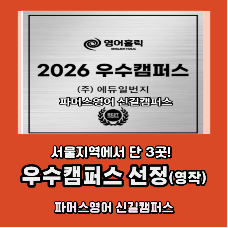 ✍️ 안녕하세요 파머스영어 신길캠퍼스입니다. 오늘은 학부모님들과 학생들에게 정말 자랑스럽고 감사한 소식을 전해드리려고 합니다. 저희 파머스영어 신길캠퍼스가 ‘2026 우수캠퍼스’로 선정되었습니다! 특히 이번 우수캠퍼스는 ✔ 서울 전체에서 단 3개 학원만 선정 ✔ 교육 품질, 학생 성취도, 운영 시스템, 학부모 만족도까지 ✔ 전반적인 교육력을 종합 평가한 결과라서 의미가 더욱 큽니다. 이 상은 단순한 ‘명패’가 아니라, ✔ 아이들의 영어 실력이 실제로 향상되고 ✔ 발표·영작·읽기·말하기까지 균형 있게 성장하고 ✔ 학부모님들이 믿고 맡길 수 있는 학원이라는 점을 공식적으로 인정받았다는 뜻이라 생각합니다....... <img src="https://blogthumb.pstatic.net/MjAyNjAyMTFfMjg1/MDAxNzcwODEyNzk2MjUw.9z0YarlYrljhz-85rXn0uDZfQLQ-hQbMrCFY1z4ABi4g.bzrUV-PQdPwRCv2auidfIGRRDyZ2douxuWhI-TQa4T0g.PNG/KakaoTalk_20260211_212515363.png?type=s3" />