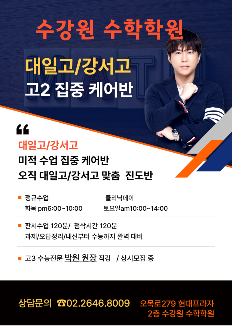 대일고/강서고 고2학생들은 학교 운영상 1학기에 미적수업부터 수학 진도가 진행 된다고 합니다. 미적으로 첫 중간고사가 진행됨으로 일년내내 타학교와 다른 진도로 내신대비를 준비해야하는데요, 그래서 수강원에서는 대일고/강서고 만을 위한 집중 케어반을 모집하고 있습니다. 정규수업: 화목 18:00~22:00 클리닉데이:토요일 10:00~14:00 수강원 박원 원장님께서 수업을 하십니다. 판서수업120분/첨삭120분으로 진행되고 주1회 토요일마다 클리닉데이로 첨삭 진행이 진행되니 대도록이면 참여할 수 있도록 ‘화목토’로 시간을 내주셔야 합니다. 3월 5일 목요일부터 첫 강의가 시작되고 첫 강의부터 수업을 촬영하여 진행하기에 도중에 입학....... <img src="https://blogthumb.pstatic.net/MjAyNjAzMDRfMTQ1/MDAxNzcyNjI2OTc0Nzcw.R62cERuDAQTN-EPEhXDCAufVziRWyfEFyLm7fiBGIRog.2MjtnNWR91g2M5tof0RWtJ9zNd5NZLs-wrgPtFyJEQwg.PNG/IMG%A3%DF1062.PNG?type=s3" />