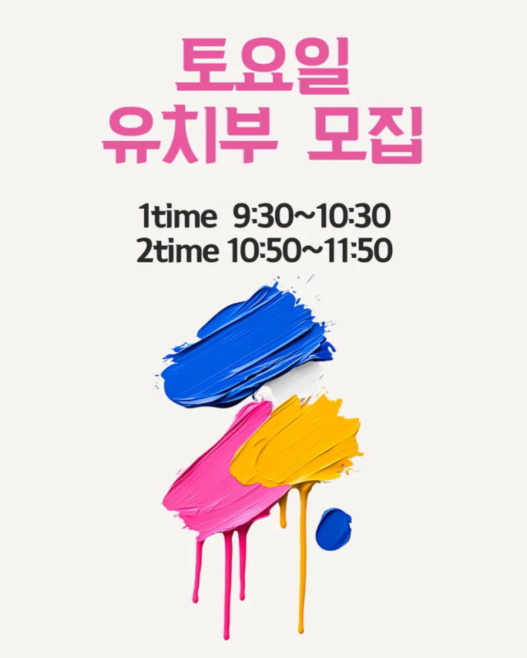 토요일 유치부 수업 개강 안녕하세요. 헤이아트미술학원입니다.^^ 4월부터 토요일 유치부 수업을 새로 오픈합니다. 1time-9:30~10:30 2time-10:50~11:50 각 반 정원 4명 매 수업후 피드백 유치부 전임 선생님 직접 수업 궁금하신 점이 있으시면 문의주세요!!! https://open.kakao.com/o/sbPshj1h <img src="https://blogthumb.pstatic.net/MjAyNjAzMjBfMTMw/MDAxNzc0MDEzODc2ODA3.DroCak-1esjkn9lGACrlT628OCUCe8XlZqvQw2M6nDIg.AD44dkKKAIF3MtenfHV106OY3qdABCjNWSvooDO86jQg.PNG/900%A3%DF%C0%AF%C4%A1%BA%CE%BF%C0%C7%C2%A3%DF20260320%A3%DF220601%A3%DF0000.png?type=s3" />