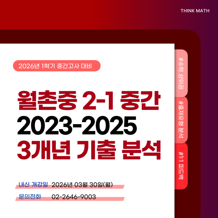 안녕하세요! 기말고사만큼이나 중요한 1학기 첫 단추, 월촌중학교 2학년 1학기 수학 중간고사가 다가오고 있습니다. 2023년부터 2025년까지 최근 3개년간의 기출문제를 정밀 분석한 결과, 나오는 유형은 정해져 있다는 사실을 확인했습니다.효율적인 공부를 위해 반드시 체크해야 할 핵심 출제 경향을 정리해 드립니다. 지금까지 월촌중학교 2학년 1학기 중간고사 최근 3개년 기출 경향을 살펴보았습니다. 시험 준비의 핵심은 단순히 문제를 많이 푸는 것이 아니라, 출제자의 의도를 파악하는 것입니다. 이 분석 자료가 여러분의 노력이 빛을 발하는 밑거름이 되기를 바랍니다. 남은 기간 선택과 집중을 통해 전략적으로 대비한다면, 반드시 만족....... <img src="https://blogthumb.pstatic.net/MjAyNjAzMjBfNzkg/MDAxNzczOTg2NDE4MDA4.1TXDwTRRzdoYr6AJIDlhp8IB-5mtBgQJRJIgTjXX2Jkg.5Y2mcAQEcdxniAK3YXgAMLULHNu6xP21cZtHQs917Jsg.PNG/%C1%A6%B8%F1%C0%BB_%C0%D4%B7%C2%C7%D8%C1%D6%BC%BC%BF%E4._%2823%29.png?type=s3" />