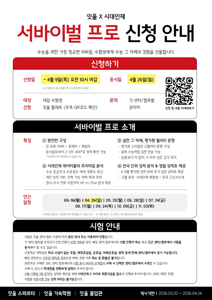 안녕하세요! 독학재수학원 잇올스파르타 목동1센터 입니다. 오늘은 4월 더프 & 서프 모의고사 신청 안내드립니다~ƪʕ◠-◕ʔᕗ* 시대인재 서바이벌 프로 모의고사 [시대인재 서바이벌 프로 신청 안내] ✔️신청일 : ~4월 9일(목) 오전 10시 마감 ✔️응시일 : 4월 26일(일) ✔️신청 : 잇올 팔레트(QR 코드 확인) ✔️문의 : 각 센터 관리자 서바이벌 프로가 더 궁금하다면 여기로! 대성 더 프리미엄 모의고사 [대성 더 프리미엄 모의고사 신청 안내] ✔️신청일 : ~4월 6일(목) 오전 10시 마감 ✔️응시일 : 4월 17일(금) ✔️신청 : 잇올 팔레트(QR 코드 확인) ✔️문의 : 각 센터 관리자 더프 모의고사가 더 궁금하다면 여기로! 서프/더....... <img src="https://blogthumb.pstatic.net/MjAyNjAzMjFfMjcg/MDAxNzc0MDU5ODk2ODA2.A0FzEwKihkDEMhipzP6bVjXIaFuGEGf3eFj6M5jKiCIg.VKPIoHiOQWKgsHThUcoVXsowG12OTKrrJBtkifp9N-Eg.JPEG/260320_4%BF%F9_%BC%AD%C7%C1_%BD%C5%C3%BB_%BE%C8%B3%BB_%B8%B6%C4%C9%C6%C3%BF%EE%BF%B5%C6%C0_ver1.0.jpg?type=s3" />