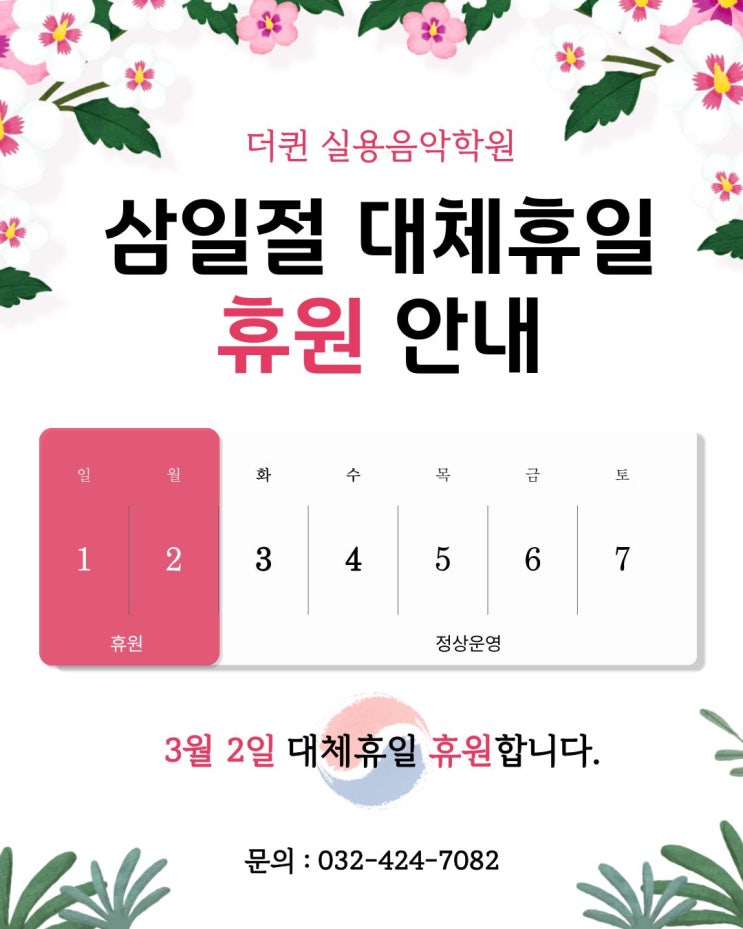 [부천 더퀸 실용음악학원] 2026년 3월 2일(월) 대체휴일 휴원 공지