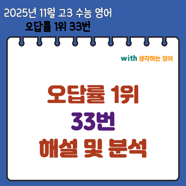 생각하는 영어입니다! 오늘 살펴볼 포스팅 주제는 2025년 11월에 실시된 고3 수능 시험에서 오답률 1위를 기록한 33번 문제입니다. 여러분~~~ 함께 풀어 보아요! 33. 다음 빈칸에 들어갈 말로 가장 적절한 것을 고르시오. Giving clients sufficient opportunity to react to your designs while in progress is a key to professional success. Similarly, involving prospective building users as well as clients is even more valuable in the long run. Say your client is a large corporation, such as a health care provider. While the hospital administration may serve as your client, no doubt the perspectives of administrati....... <img src="https://blogthumb.pstatic.net/MjAyNjAyMjNfMjI4/MDAxNzcxODMxNjQyMjE1.JK-rMvE3NtWtz-fCckvo451-CmxEuqGzjfRxvC5tgSsg.FaAFCSpZx3wWGPjS-882dJhlqRkUINs0rTdftHwac1Mg.PNG/%C1%A6%B8%F1%C0%BB-%C0%D4%B7%C2%C7%D8%C1%D6%BC%BC%BF%E4_-001.png?type=s3" />