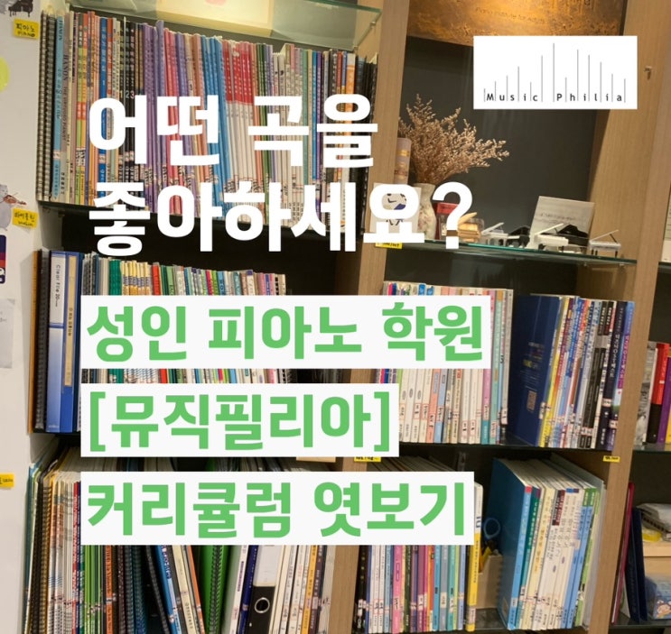 안녕하세요. 어른들의, 어른들만을 위해 만들어진 음악 놀이터 뮤직필리아입니다. 피아노를 다시 시작하고 싶지만, "너무 늦지는 않았을까?", "내가 원하는 곡을 배울 수 있을까?" 고민하며 학원 문 앞까지 왔다가 돌아가신 적 있으신가요? 그런 여러분들의 고민에 대한 대답으로, 오늘은 저희 학원의 자랑이자, 제가 가장 많은 시간을 보내며 연구하는 공간인 **'악보장'**을 살짝 보여드리려고 해요. 뮤직필리아의 악보장을 보시며, 나는 어떤 곡들을 배울 수 있는지, 어른들은 어떤 과정들로 피아노를 배우는지 커리큘럼 살짝 엿보세요. 뮤직필리아의 문은 언제나 당신의 로망에 활짝 열려 있습니다. 기초....... <img src="https://blogthumb.pstatic.net/MjAyNjAzMDVfMjQx/MDAxNzcyNjg2Njk1MTQ3.uAGhX38rnWJ5bEZ_zsbhFIxobFWgLBtSSKCK3S8XZZ8g.yAUOzXXA4wBUy-BjlGgYalmENoXp7A9bzrdUz-IDlxgg.JPEG/output%A3%DF387274445.jpg?type=s3" />