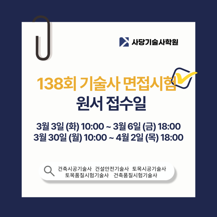 안녕하세요 기술사 합격으로 가는 지름길 사당기술사학원입니다. 제 138회 기술사 면접시험 원서접수가 시작되었습니다. 이번 면접시험 접수는 2차로 진행되는데요. 현재는 면접 재수생을 대상으로 접수가 가능합니다. 3월 3일(화) 10:00 ~ 3월 6일(금) 18:00 아직 접수를 완료하지 않은 재수생은 기한 내에 반드시 접수하시기 바랍니다. 이어 138회 면접시험 2차 접수는 오는 3월 25일 필기시험 합격자 발표 이후, 3월 30일(월) 10:00 ~ 4월 6일(목) 18:00 진행됩니다. 매회차 시간대별로 접수 가능 인원이 빠르게 마감되는 경우가 있으니, 필기합격생은 큐넷 공지를 빠르게 확인하시어 신속하게 접수하는 것이 좋습니다. 면접일 및 시험 시간대....... <img src="https://blogthumb.pstatic.net/MjAyNjAzMDVfODYg/MDAxNzcyNjM5OTM4NTI5.JnzOPPy_WuZE134Z6RERn56Cks9o-Qa1dhoSIz1XKekg.7_jwvBCKNIwmQFL1TpT-4wRvR-fK54ehs7k3PnS67ikg.PNG/%BD%E6%B3%D7%C0%CF_%BB%F9%C7%C3.png?type=s3" />