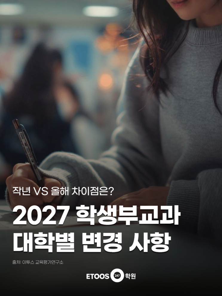 안녕하세요! 이투스247학원 공식 블로그입니다. 오늘은 2027학년도 학생부교과 전형에 변경 사항이 생긴 대학과 그 내용을 알아보고자 하는데요! 학생부교과 전형 중 변경 사항이 생긴 대학 리스트를 확인하여 희망 대학이 있는 분은 아래 내용을 참고해 주세요! *출처: 이투스 교육평가연구소 *2027학년도 전형 계획안 기준 2027 학생부교과 변경 대학 가천대, 가톨릭대, 경희대, 단국대, 덕성여대, 동덕여대, 명지대, 서울시립대, 성균관대, 성신여대, 숙명여대, 숭실대, 아주대, 한국외대, 홍익대 2027 학생부교과 전형 변경 사항 - 가천대, 가톨릭대, 경희대, 단국대(죽전) 가천대는 2027학년도부터 학생부교과 전형 중 학생부우수자 전형은....... <img src="https://blogthumb.pstatic.net/MjAyNjAzMDZfMzQg/MDAxNzcyNzY0Mjk2NzM5.YefABGfM_QExMZCyVvdVuLHlExygNYlGNBmK2mUfGRYg.OLjvF6tPmHq2hAIw8-6BtEyfGAKglpWnry_XChzRXwYg.PNG/1.png?type=s3" />