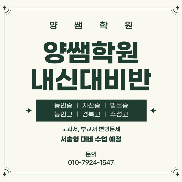 안녕하세요. 양쌤학원입니다. 설레는 시작, 새로움이 가득한 3월 잘 보내고 있으신가요? 오늘은 새로운 시작에 탄탄한 디딤돌이 되어줄 양쌤학원의 내신대비 교재를 소개하려 합니다. 내신을 대비할 양쌤의 3Step 중 첫 번째인 1차 교재를 소개합니다. 양쌤학원 내신대비 자체교재 구성과 특장점 소개 1. 높은 적중률 : 최신 기출문제를 분석한 데이터를 기반으로 학교 시험 적중률을 높였습니다. 2. 다양한 구성 : 학습 목적에 따른 교재 선택이 가능한 다양한 구성 3. 개인별 맞춤 오답 관리 : 쌍둥이 문제, 유사문제 기능으로 개별적인 오답 관리가 가능합니다. 교과서 빈출 탄탄한 기본을 위해 교과서와 시험 문제를 분석하여 꼭! 풀어봐야 할....... <img src="https://blogthumb.pstatic.net/MjAyNjAzMDdfMjM1/MDAxNzcyODYxMjA1Nzg3.-5xSVzXtOhtOiRfc2PcvMoSiOYRInkEUg-R4mjy5QdIg.i_UVPTyPUL15qc1wW8-cQidEENiko2j4Iak5i55IUv4g.JPEG/%B3%BB%BD%C5%B4%EB%BA%F1%B9%DD.jpg?type=s3" />