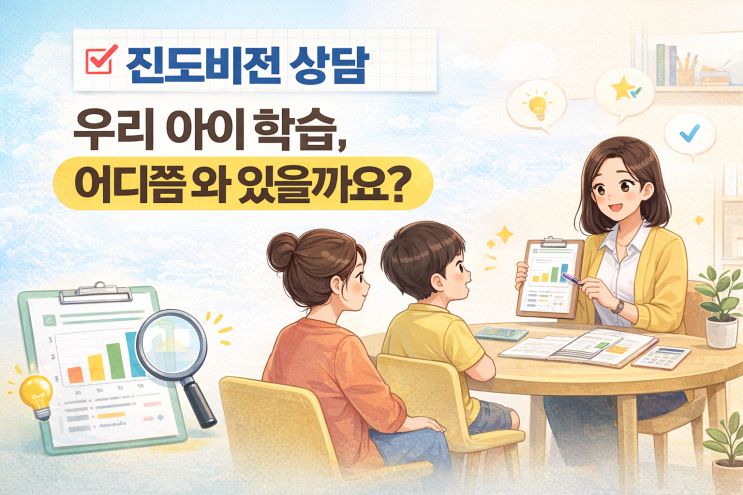 진도비전 상담으로 한눈에 확인하세요 아이 공부를 지켜보다 보면 이런 생각이 들 때가 있습니다. “열심히는 하는 것 같은데, 잘 가고 있는 걸까?” “지금 방식이 우리 아이에게 맞는 걸까?” 이런 고민을 덜어드리기 위해 저희는 진도비전 상담을 통해 아이의 학습 상태와 앞으로의 방향을 눈에 보이게 안내해 드리고 있습니다. 진도비전 상담이란? 진도비전 상담은 아이의 현재 학습 수준, 지금까지의 학습 과정, 그리고 앞으로의 학습 방향을 한 장의 상담지로 정리해 드리는 상담입니다. 단순히 “잘하고 있어요”, “조금 부족해요”가 아니라 ✔ 지금 어느 위치에 있는지 ✔ 왜 이 과정이 필요한지 ✔ 앞으로 어떻게 공부하게 될지....... <img src="https://blogthumb.pstatic.net/MjAyNjAxMjdfMTcx/MDAxNzY5NDk4MjgzMTM5.ULnMnJNwHG0ZMeu9G_sb_5HJw1XUVE3EVyLUnMVlt_Eg.yW5_1Cz7lIqFGrsvRrp-7OeW8UlMu3F9d43W591O6Ykg.PNG/image.png?type=s3" />