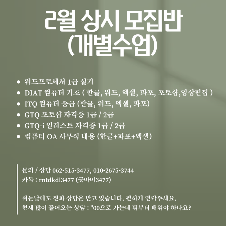 안녕하세요~!! 최대한 쉽고, 친절하게 가르치는 굿아이컴퓨터학원 노랑머리 쌤 입니다. 2월 상시모집 OPEN 겨울방학이 끝나고 새 학기가 시작되기 전, 설날이 지나가기 전! 우리 아이들 공부 시키기 가장 좋은 시기입니다. 굿아이컴퓨터학원에서는 상시모집의 경우 개별수업으로 진행하기에 몰라서 넘어가거나, 다같이 똑같은걸 배우지 않습니다. 한명 한명에게 맞춰, 필요한 부분은 하되 이 친구에게 필요하지 않은 부분은 넘어갑니다. 개별수업이란? 말 그대로 이 친구 한명에게 맞춘 수업입니다. 잘하는데 그 부분을 또 복습하고 있을 필요는 X 조금 더 연습이 필요하거나 응용력이 키워지면 좋은 부분들을 더 건드려 주는거죠! 모집 대상 아....... <img src="https://blogthumb.pstatic.net/MjAyNjAxMjdfMjM3/MDAxNzY5NTAyMzM0MTcw.VHKr3b1ZLL5_268XJW5PYoXHS5aWfL_Z0lwPpqWua1Ag.UgOQ2UenEEB0KzFE40VPE7d__1ZlaAj1hHMtWu4qKDMg.PNG/%C1%A6%B8%F1%C0%BB_%C0%D4%B7%C2%C7%D8%C1%D6%BC%BC%BF%E4._%288%29.png?type=s3" />