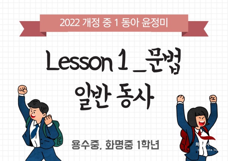 중학교 영어를 시작하면 가장 먼저 만나게 되는 문법이 있습니다. 바로 be동사와 일반동사입니다. 초등학교 때는 문장을 “느낌”으로 읽어도 크게 문제가 없었다면, 중학교 영어부터는 문장의 구조와 규칙을 이해해야 시험에서도, 독해에서도 흔들리지 않아요. 이번 포스팅에서는 용수중 1학년 영어 1과 문법의 핵심인 be동사와 일반동사를 처음 중학교 영어를 배우는 학생도 이해할 수 있도록 기초부터 차근차근 정리해 보려고 합니다. 본격적으로 들어가기 전에, “동사가 뭐지?”라는 생각이 든다면 동사가 포함된 품사와 문장 구성 성분의 기본 개념을 먼저 보고 오면 내용이 훨씬 쉽게 느껴질 거예요. 영어 단어와 품사 : 네이버 블로그 영....... <img src="https://blogthumb.pstatic.net/MjAyNjAyMTNfNjcg/MDAxNzcwOTgxNTk4MDgx.icPbuWCBxLgbxkqebfMxF4ziLunHccgTpD-VlKDn6ysg.G_-Km5t5KDroucJ-jUMmNRqsmQjaTSNxSFa5Qa2NoxAg.JPEG/%C7%D0%B1%B3%BA%B0_%B9%AE%B9%FD_%281%29.jpg?type=s3" />