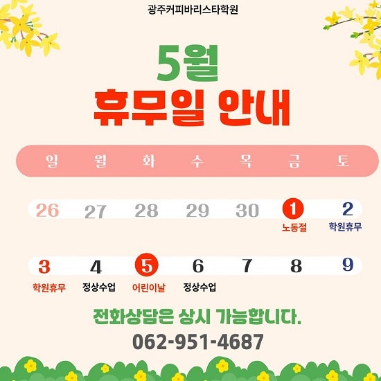 안녕하세요. 광주커피바리스타학원입니다. 노동절 5월1일 금요일과 어린이날 5월5일 화요일은 학원 휴무 입니다. 5월4일 월요일은 정상수업하고 5월6일 수요일부터 정상수업합니다. 전화상담은 상시 가능합니다. 문의사항은 062-951-4687로 연락주세요. <img src="https://blogthumb.pstatic.net/MjAyNjA0MjdfNTgg/MDAxNzc3MjQ3Mzg4MDI1.CeeBvKdd6M3G2sHOAJuYP8tIIgCR3_GZnIVVkDBMz_og.ROZD7XlbD19nL07psYEJ-pb_JD26uiQOO0W-UvPxm5cg.JPEG/26%B3%E25%BF%F9%C8%DE%B9%AB.jpg?type=s3" />
