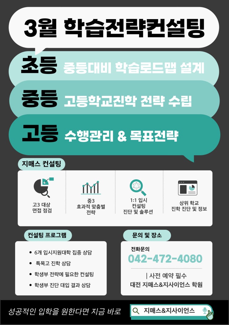 맞춤 학습 컨설팅 데이 안녕하세요, 지매스&지사이언스 학원입니다. 저희 학원에서는 학생들의 학년별 특성에 맞춰 수행관리 & 목표전략 컨설팅을 진행합니다. 학생 개개인의 현재 상황을 분석하고, 실질적인 도움이 되는 컨설팅으로 입시 준비를 함께하겠습니다. 초등 학습 습관 형성 & 기초 완성 전략 자기주도 학습 습관 형성 과목별 기초 개념 점검 수행평가·단원평가 대비 중학교 대비 학습 방향 설정 중등 내신 관리 & 고등 대비 전략 수행평가 체계적 관리 서술형·내신 시험 분석 과목별 목표 등급 설정 고등학교 진학 전략 설계 고등 1 수행평가 관리 & 성적 분석 수행평가 집중 관리 내신 성적....... <img src="https://blogthumb.pstatic.net/MjAyNjAyMTNfMjAz/MDAxNzcwOTgxMjU3ODIw.YH6l9ep47zXS_l3NlOPOOTgT81eJLcLdSdXG3M3xfjgg.41Qt6p3QVo52giO4OtvC4uibUlQ2ngHlPu8oTNDy_ccg.JPEG/005.jpg?type=s3" />