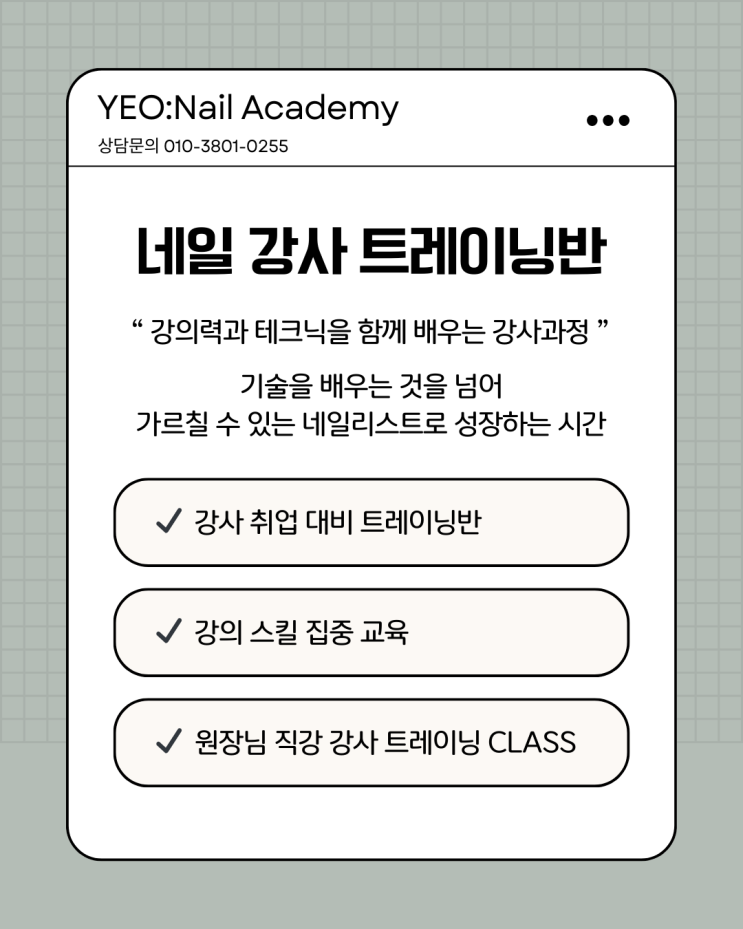 안녕하세요 #울산네일전문학원 #여_울산네일전문학원 입니다 ^^ 오늘은 봄비를 알리는 비가 추적추적 내리네요 날씨가 따뜻했다가 추웠다가 무한 반복인데 .. 얼른 날씨가 따뜻해져서 봄이 오면 좋겠어요ㅠㅠ 오늘은 강사트레이닝반 모집에 대한 포스팅을 해볼까 합니다♡ 전문 네일강사를 목표로 한다면, 이제는 '가르치는 실력'까지 준비해야 합니다 네일 기술만 잘한다고 강사가 될 수는 없습니다 강사는 정확한 전달력, 체계적인 수업 운영 능력, 실전 티칭 노하우가 함께 갖춰져야 합니다 강사트레이닝반은 실제 교육 현장에서 바로 활용 가능한 강의 역량을 집중적으로 완성하는 과정입니다 ※ 강사트레이닝반이 필요한 이유 기....... <img src="https://blogthumb.pstatic.net/MjAyNjAzMThfNTkg/MDAxNzczNzk4NzkzMDg3._iAFszTmI70o-ge7Omm7iHX93szjGJnwp2rKR5ajd7Ag.vB0xUe4bEWcT2R6xa3x9JiGLtxc0w6cp_eVUNEVf7mwg.PNG/image.png?type=s3" />