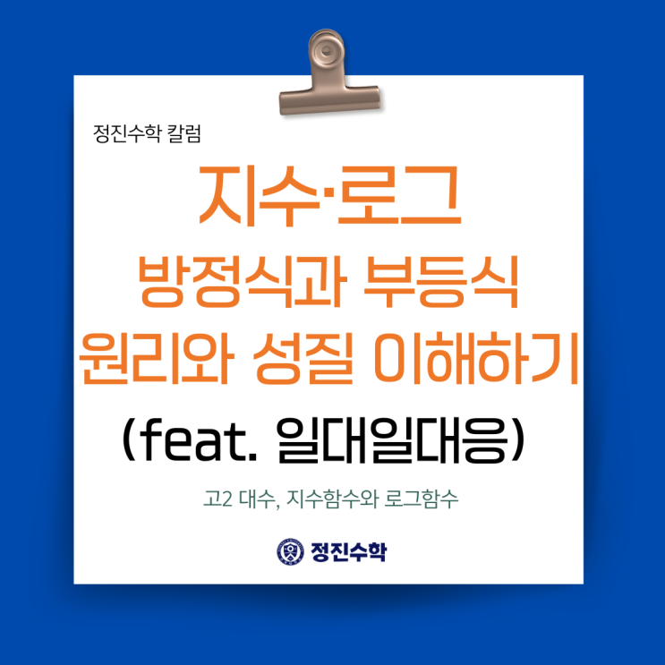 안녕하세요 생각의 깊이가 다른 수학, 세종시 도담동 수학전문 정진수학입니다. 지난 글들을 통해 지수·로그함수의 그래프와 최대·최소를 정복하셨나요? 이제 지수·로그함수의 마지막 관문, [방정식과 부등식]입니다. 우리가 2x=23이라는 식을 볼 때, 너무나 당연하게 "밑이 2로 같으니까 지수끼리 비교해서 x=3이네!"라고 풉니다. 그런데 잠깐, 왜 밑을 마음대로 없애고 지수만 비교해도 되는 걸까요? 이차방정식 x2=32에서는 x=3 뿐만 아니라 x=-3도 있잖아요? 지수방정식에서는 가능합니다. 그 이유는 지수함수와 로그함수가 가진 특별한 성질, '일대일대응' 때문입니다. 오늘은 이 원리에서 시....... <img src="https://blogthumb.pstatic.net/MjAyNjAyMTJfNjgg/MDAxNzcwODgxMTc1OTI0.HIwcJNxq5VM89CoZaQZCQzlDQ-Cq0KjoIQMmh7Mo4C0g.Cg-5ZjEYnKooYfN-WUOOslMdTSQnVIxCdG1wlqUIXykg.PNG/%C1%A4%C1%F8%BC%F6%C7%D0_%C4%AE%B7%B3_-_%C1%F6%BC%F6%B7%CE%B1%D7_%B9%E6%C1%A4%BD%C4%B0%FA_%BA%CE%B5%EE%BD%C4.png?type=s3" />