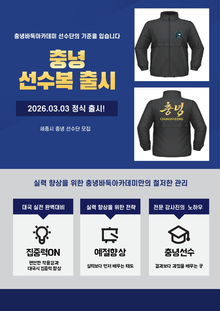 ♟️ 유니폼 출시 기념, 4계절 시즌리그 운영 안녕하세요 세종시 충녕비스타 바둑학원 고운점 박원장입니다. 이번에 충녕 바둑학원 고운점·새롬점·반곡점이 함께 공식 유니폼을 새롭게 준비하게 되었습니다. 세종시 고운동에서 바둑을 배우는 우리 아이들이 같은 유니폼을 입고 한 팀으로 성장하게 될 생각을 하니 벌써부터 설레는 마음입니다. 유니폼에 담은 의미 이번 유니폼은 단순한 학원복이 아닙니다. 같은 옷을 입는다는 것은 같은 목표를 향해 나아간다는 의미이기도 합니다. ✔ 지점이 달라도 하나의 팀 ✔ 서로를 존중하는 바둑 예절 ✔ 스스로 책임지는 ‘선수’의 태도 아이들이 유니폼을 입는 순간, 조금 더 단정해지고 조....... <img src="https://blogthumb.pstatic.net/MjAyNjAyMTRfMjY3/MDAxNzcxMDMxOTc1NjUy.t1oI9Ylgy5KzmbNMQasjK4o6NnLKz4ZPcpjQ_whbHJog.xPkmb59J8XRgnVxBwW9k-GAdLvW5ZHsDD54tdCod8ocg.JPEG/%B9%DD%B0%EE%C1%A1.jpg?type=s3" />