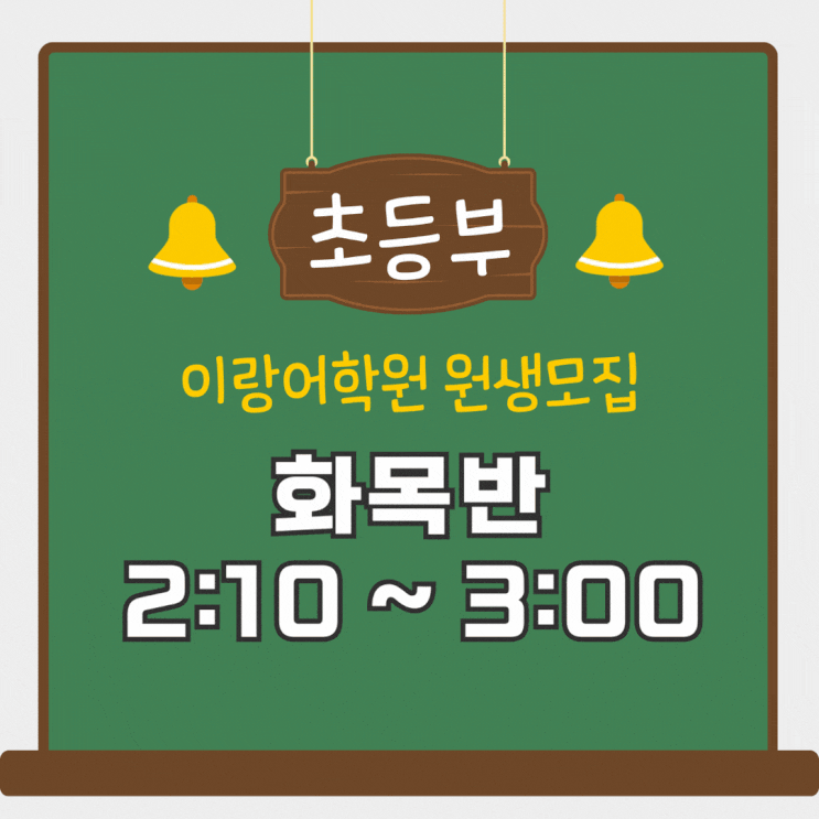 [초등부 화요일, 목요일 창의영어와 파닉스반 신규 개설 안내] 안녕하세요, 이랑어학원입니다. 아이에게 영어를 처음 시작하게 할 때 부모님의 마음은 늘 조심스럽습니다. “지금 시작해도 괜찮을까?” “너무 어렵게 느끼진 않을까?” “영어를 싫어하게 되면 어쩌지…” 그 마음, 충분히 이해합니다. 그래서 저희 이랑어학원에서는 초등부 아이들을 위한 창의영어와 파닉스 격주반을 새롭게 개설합니다! 수업 소개 수업명: 창의영어와 파닉스 격주반. 대상: 영어를 처음 시작하는 8세 이상 정원: 6명 수업 시작일 : 26년 3월 31일 화요일 수업 시간: 매주 화요일, 목요일 오후 2:10 ~ 3:00 (총 50분) 담당 선생님 : 원어민 선생님 주....... <img src="https://blogthumb.pstatic.net/MjAyNjAyMTlfNzkg/MDAxNzcxNDgzMTM5NTQ2.DfAqd_X6zidJzohqS91sgdrHBf8TMDhefFGKVwxcHXgg.-mmfD4ATLR7TeJQlCd-UmBTrDteeKfFPd84CAsL08_sg.GIF/Lost_Dog_%2818%29.gif?type=s3" />