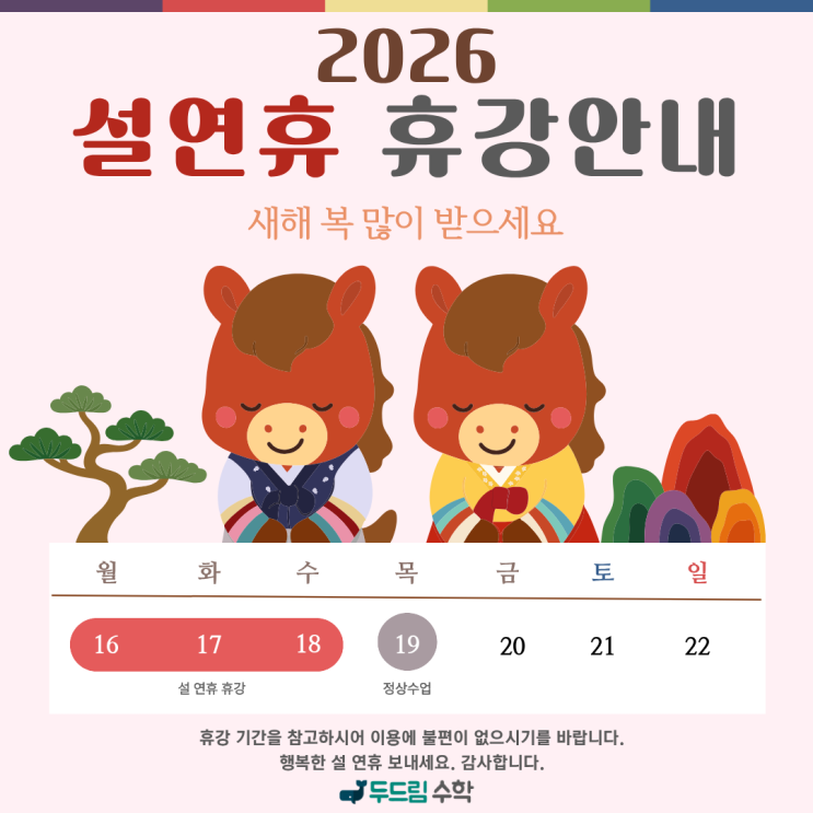 중앙동 성남동 신흥3동 수진1동 수학 두드림수학 26년 2월 설 연휴 휴강 안내