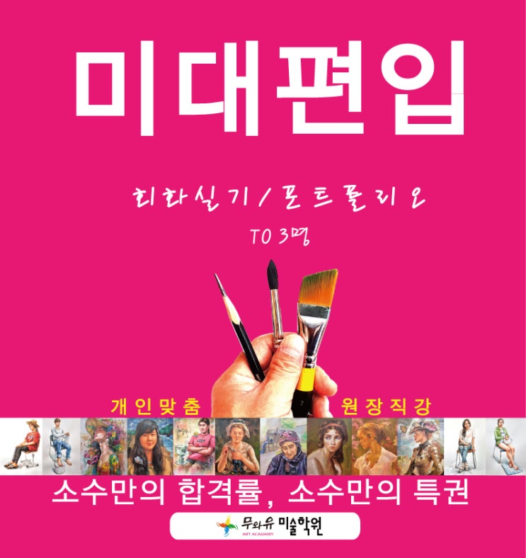 소수 개인 맞춤 피드백 원장입니다. 미술대학 수시/정시 및 전문대학 입학하였지만, 한 단계 성장과 도전을 생각해 보았을 것입니다. 1, 2학년 때 교양과목 수업이 많고, 반면에 전공수업 시수가 적어 편입 실기 준비에 어려움이 생기기도 합니다. 실기시험 과목과 포트폴리오 준비를 해야 한다면, 미리미리 챙겨두어야 합니다. 올바른 미술교육 / 정직한 미술교육 / 성실한 미술교육 39년간 쉼 없는 가르침 노하우 바탕으로 한 남다른 교습법. 미래를 성장시켜갈 수 있는 방향으로 이끌어 갑니다. 학생 그림에 절대 리터치 하지 않는 피드백 수업 원장 직강 소수 개인별 맞춤 1:1 피드백 소수 정원제 수업 개인 맞춤 교육으로 진심과 정성으로 교....... <img src="https://blogthumb.pstatic.net/MjAyNjAzMDZfMjIw/MDAxNzcyNzcyNjgyMjM5.y7zhrO1XQci2ePaxHHxp_y-udXHH-vCTQ7dO9NJFzPQg.N0r9xfVtIPuBTIKQ5qbKvvr2-3NxXa-jKaQOg2geBqQg.JPEG/%B9%CC%B4%EB%C6%ED%C0%D4%C8%AB%BA%B8-%C8%B8%C8%AD.jpg?type=s3" />