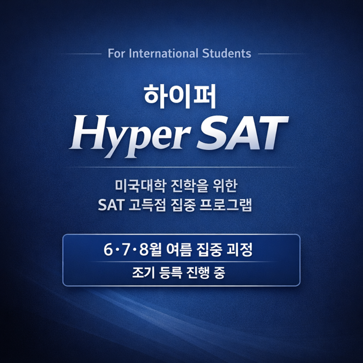 '하이퍼 Hyper SAT' 가장 빠른 SAT 고득점 프로그램 6, 7, 8월 여름 집중 과정 조기 등록 진행중, 분당 SAT 학원 추천, 이제이플러스 어학원 '하이퍼 Hyper SAT' 란? 정상적인 영어학습, 스탠다드 프로그램의 '하이퍼 Hyper SAT' 과정은 학습 효율에 있어 일반 학원의 SAT 프로그램과 큰 차이가 있습니다. SAT 학습에 필수적인 어휘 및 표현의 인풋 학습이 노하우가 집약된 자체 교재를 사용 수업중 실시간으로 이루어지며, 디지털 SAT의 본질인 논리 추론 유형에 대한 분석이 방대한 실전 문제를 통한 극대화된 밀도로 다루어집니다. 하이퍼 Hyper SAT 프로그램 일정 > 5월 25일(월)~8월 28일(금) (총14주) &g....... <img src="https://blogthumb.pstatic.net/MjAyNjAzMDJfMjYy/MDAxNzcyNDIzOTY3OTAz.m1yK9Dz_JMrdwSJf9HtMkH-l6155p47f36zVHWQ0cD8g.ko09fHv4y3wty9Y2vD6MqX9M06NJf61v38v4C0gftEEg.PNG/sat%BF%A9%B8%A7.png?type=s3" />
