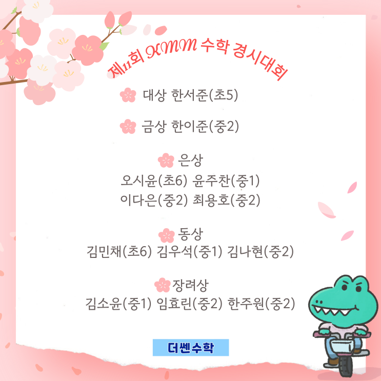 안녕하세요. 더쎈수학 삼현학원입니다. 매월 진행되고 있는 KMM 수학 경시대회 결과가 발표되었습니다. 이번 시험에서도 우리 더쎈수학 학생들이 좋은 결과를 보여주었습니다. 꾸준히 도전하고 노력한 학생들에게 큰 박수를 보냅니다. 틀린 문제를 다시 풀어보고, 개념을 점검하며 끝까지 집중해준 모습이 무척 인상적이었습니다. 수학 실력은 한 번의 시험으로 만들어지는 것이 아니라 꾸준한 개념 학습과 반복 훈련을 통해 차근차근 성장합니다. 앞으로도 더쎈수학에서는 학생들이 스스로 생각하고 해결하는 힘을 키울 수 있도록 지도하겠습니다. 수상한 학생들 모두 진심으로 축하합니다. 또한 도전해 준 모든 학생들도 정말 수고했....... <img src="https://blogthumb.pstatic.net/MjAyNjAzMDZfMjE4/MDAxNzcyNzcyNDg0NTIz.Wjfg4MmXLKrRKCNE8nsQrKHF23llc3IZAo6r31fc7O0g.tYGdvRR95CTl9Py-MqVGUHGfrzGE2-Io0PQS63gp0Aog.PNG/image.png?type=s3" />