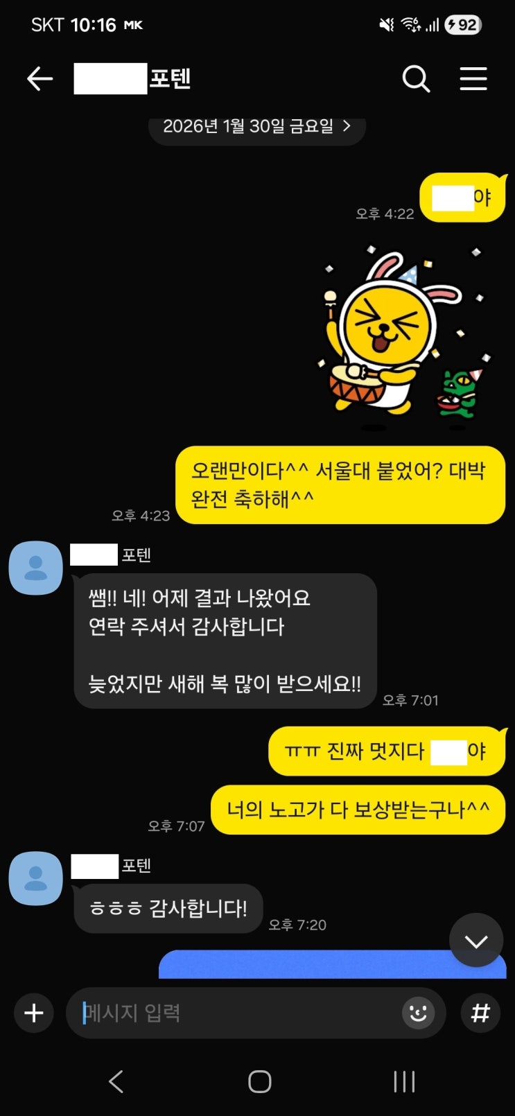 안녕하세요! 요즘 특강 수업으로 아이들과 치열한 방학을 보내고 있습니다 . 바쁜 하루하루를 보내던 중 너무너무 반가운 소식을 듣게 되었습니다~! 바로 대학 합격 소식입니다!! 이번에 연락 온 제자는 두 명입니다. 제자들이 보낸 메시지를 보자마자 기쁨의 탄성이 터져나왔습니다! 아! 드디어 아이들의 노력이 결실을 보다니 너무 기쁘고 감사했습니다!! 한명은 서울대 식품영양학과 (고려대 기계공학 동시합격)와 다른 한명은 연세대 생명과학부 (대구카톡릭대 약대는 기다리는 중)를 각각 진학하게 되었습니다!(예정) 자랑하고 싶다고 하니깐~ 합격증 보내주네요 ^^ 둘다 정명고 출신인데 내신이 나쁘지 않았지만 자신이 가고 싶은 대학에는....... <img src="https://blogthumb.pstatic.net/MjAyNjAyMDlfMTA2/MDAxNzcwNjEyODg5NTA0.0ynHcGDqiOlKDHXIScQR0HhCbuRZ-840LxztWO__HeQg.NDUhk4EclJGuCkyqZBzHZTw8btw-oagTpXv9KHIH73Eg.JPEG/KakaoTalk_20260207_101820331_01.jpg?type=s3" />
