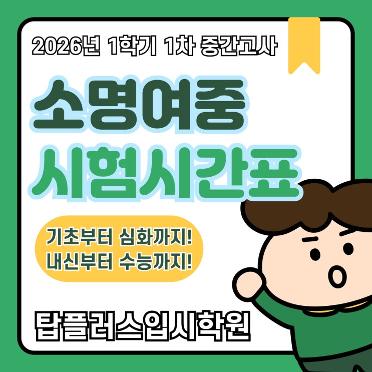 이번 포스팅은 2026년 소명여자중학교 1학기 1차 중간고사 지필평가 일정입니다. 소명여중 학사일정을 다시 한번 확인하세요. 26 1학기 첫 시험의 좋은 결실을 기원합니다. 소명여중은 4월 27, 28일 이틀동안 중간고사를 실시합니다. 2학년은 영어, 수학, 도덕 3학년은 영어, 수학, 역사 3과목만 실시하므로 크게 부담이 되는 과목수는 아닙니다. 평소에 꾸준히 열심히 하는 학생이면 세 과목 만점에 도전해서 올백의 성취감을 느껴보세요. 수학문제는 소명여중은 소명여고와 비슷하게 계산을 잘 해야 합니다. 답이 분수로 나오는 경우도 많으니 풀이과정을 꼼꼼히 쓰는 습관을 가져야 합니다. 시험범위 및 시간을 확인하여 좋은 결과 받으세요. ....... <img src="https://blogthumb.pstatic.net/MjAyNjA0MjNfMzAw/MDAxNzc2ODkxMTY0MjYy.B3LBMxLWzadKyDHUCGh5yVcQuvtXY7iZjkdmANYGXLMg.lQdKFgl30iKGHpdhSgOCDQN7lKdbOzGDNrKJOgmfOA0g.JPEG/%BC%D2%B8%ED%BF%A9%C1%DF-002.jpg?type=s3" />