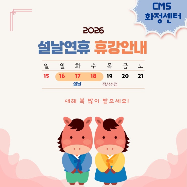 항상 보내주시는 관심과 응원에 진심으로 감사드립니다. 다가오는 설 명절을 맞아 가족과 함께 따뜻한 시간을 보내기 위해 2월 16일(금) ~ 2월 18일(일)까지 휴원합니다. 휴원 기간 : 2/16(월) ~ 2/18(수) 정상 수업 재개 : 2/19(목) 연휴 기간 동안 학원 상담 및 수업은 진행되지 않습니다. 사랑하는 가족과 웃음 가득한 설 연휴 보내시고, 새해에도 우리 아이들의 성장과 꿈을 위해 CMS화정영재교육센터가 늘 함께하겠습니다. 새해 복 많이 받으세요. <img src="https://blogthumb.pstatic.net/MjAyNjAyMTNfMjgz/MDAxNzcwOTc4NzQzNDI1.qBLhhtzrsNJLi2kplOusBfNsjboT_gzYpTPAw4nbSYcg.4xGVapnugthUtuMMygsRjgS1eqGQRlAmXcGuAbqcGnkg.JPEG/%BA%ED%B7%CE%B1%D7%BF%EB%BF%DC_%289%29.jpg?type=s3" />