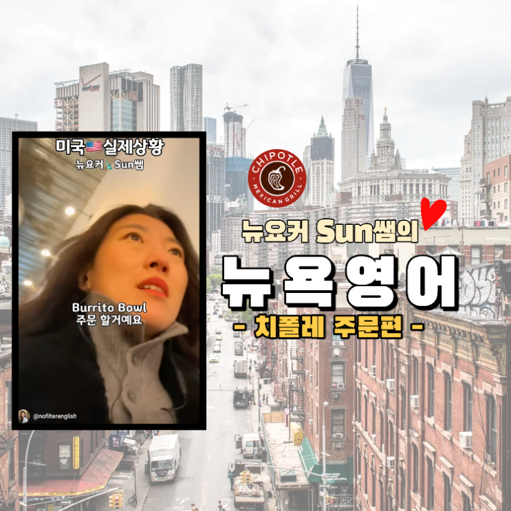 미국에서 치폴레 처음 가면 왜 다들 당황할까요? 안녕하세요, 뉴요커Sun쌤이에요! 저는 12년차 영어 강사이자 7년차 뉴요커 입니다. 반갑습니다 뉴욕/미국 여행 리스트 중에 치폴레 꼭 있으시죠?ㅎㅎ 근데 막상 가면... 직원이 엄청난 속도로 물어보고 골라야될게 많아서 당황하시는 분들이 많더라고요. 뒤에 줄은 길고 직원은 기다리고 있고 이 상황, 상상만 해도 식은땀 나죠? 걱정 마세요. 제가 있잖아요! 그래서 제가 <뉴욕 실제상황> 시리즈로 영상을 만들고 있는데요. 실제 미국 현지의 실제상황을 보여드리면서 여러분들이 미리 간접 체험을 하는 느낌을 받으실 수가 있고, 동시에 현지에서는 이런 영어를 진짜로 쓰는구....... <img src="https://blogthumb.pstatic.net/MjAyNjA0MTFfNTMg/MDAxNzc1ODU2NzU3MTg5.GhtAf8N9pUPHj-WUTvH_VEgMpZ9-X9Y95my4i3spG9Yg.I3MeDVd5nSxmxtEhp2PCahLQevG3Yc5j9DW4Zp906nkg.PNG/chipotle_thumb.png?type=s3" />